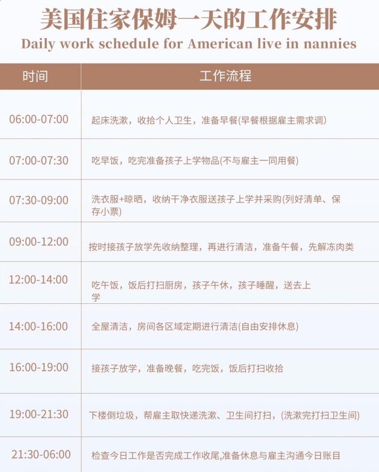 美国住家保姆一天的工作安排 A day's work schedule for a live-in nanny in the United States